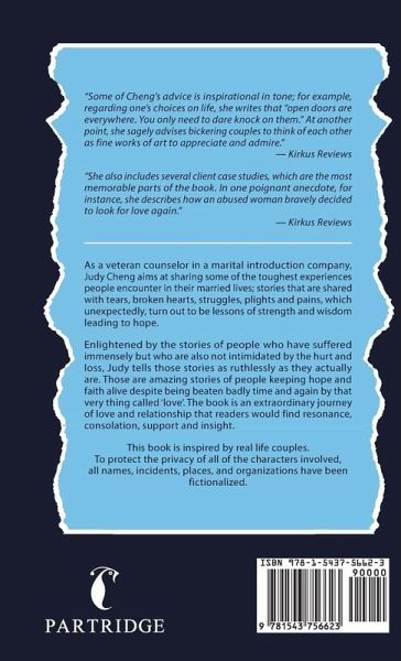 As a veteran counselor in a marital introduction company, Judy Cheng aims at sharing some of the toughest experiences people encounter in their married lives; stories that are shared with tears, broken hearts, struggles, plights and pains, which unexpectedly, turn out to be lessons of strength and wisdom leading to hope. Enlightened by the stories of people who have suffered immensely but who are also not intimidated by the hurt and loss, Judy tells those stories as ruthlessly as they actually are. Those are amazing stories of people keeping hope and faith alive despite being beaten badly time and again by that very thing called 'love'. The book is an extraordinary journey of love and relationship that readers would find resonance, consolation, support and insight. This book is inspired by real life couples. To protect the privacy of all of the characters involved, all names, incidents, places, and organizations have been fictionalized. "Some of Cheng's advice is inspirational in tone; for example, regarding one's choices on life, she writes that "open doors are everywhere. You only need to dare knock on them." At another point, she sagely advises bickering couples to think of each other as fine works of art to appreciate and admire." - Kirkus Reviews "She also includes several client case studies, which are the most memorable parts of the book. In one poignant anecdote, for instance, she describes how an abused woman bravely decided to look for love again." - Kirkus Reviews