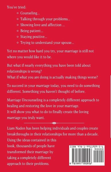 A new and different approach to your marriage that will finally give you the breakthrough you've been seeking - for the true love and intimacy that you really want. * * * * * "We have visited professionals before and never gotten such good results as when we expose ourselves to your material." - Ben and Robyn S., New York. * * * * *You've tried:Counseling... Talking through your problems... Showing love and affection ... Being patient... Staying positive... Trying to understand your spouse... Yet no matter how hard you try, your marriage is still nowhere near where you would like it to be. But what if nearly everything you have been told about relationships is wrong? What if what you are doing is actually making things worse? To succeed in marriage today, you need to do something radically different. Something you haven't thought of before.... The opposite of what you're probably doing right now... You need Marriage Uncounseling. In this book you will learn:The 3 Questions you must answer before you try to heal your marriage The 6 Foundations of all great marriages - and how to build your own marriage upon them The true cause of lack of attraction in your marriage - and how to get the passion back The real reason why your spouse won't listen - and how to ignite deep and loving communication How to get your spouse as committed to your marriage as you are - even if they want to leave The single biggest obstacle that is blocking the love in your marriage - and how to remove it to make your love thrive Marriage Uncounseling is a completely different approach to healing and restoring the love in your marriage. It will show what to do to finally create the loving marriage you want and deserve.*** Also included: Free access to the Five Ultimate Love Letters *** Five powerful letters to send to your spouse that will trigger healing, forgiveness, attraction, appreciation and commitment in your marriage.Table of ContentsChapter 1: Where to Start to Finally Heal Your Marriage Chapter 2: Three Questions You Must Answer Before You Attempt to Heal Your Marriage Chapter 3: Uncounseling: The Key to Healing and Bringing Back Love Chapter 4: What Sort of Marriage Do You Want? Chapter 5: The Real Reason Why the Passion Goes - And How to Get it Back Chapter 6: How to Create Deep and Loving Communication - by 'Doing the Opposite' Chapter 7: An Unwilling Spouse? How to Win Them Over Chapter 8: Your 'Greatest Gifts' For Healing Your Marriage - That Are Hidden in Plain Sight Chapter 9: The Ultimate Secret to Success in Your Marriage About the Author Liam Naden has been helping individuals and couples create breakthroughs in their relationships for more than a decade. Using the ideas contained in this book, thousands of people have transformed their marriage - and themselves - by taking a completely different approach to their problems.