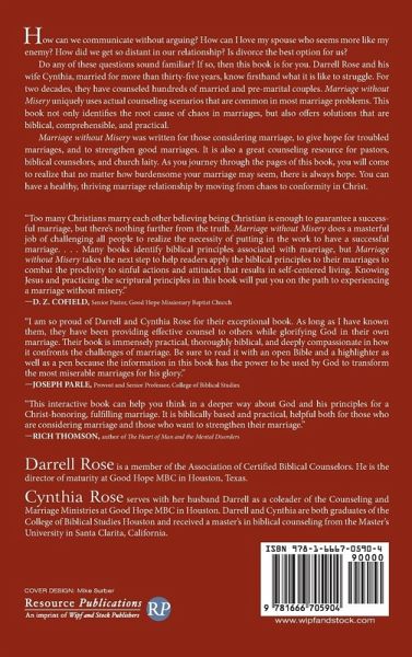 How can we communicate without arguing? How can I love my spouse who seems more like my enemy? How did we get so distant in our relationship? Is divorce the best option for us? Do any of these questions sound familiar? If so, then this book is for you. Darrell Rose and his wife Cynthia, married for more than thirty-five years, know firsthand what it is like to struggle. For two decades, they have counseled hundreds of married and pre-marital couples. Marriage without Misery uniquely uses actual counseling scenarios that are common in most marriage problems. This book not only identifies the root cause of chaos in marriages, but also offers solutions that are biblical, comprehensible, and practical. Marriage without Misery was written for those considering marriage, to give hope for troubled marriages, and to strengthen good marriages. It is also a great counseling resource for pastors, biblical counselors, and church laity. As you journey through the pages of this book, you will come to realize that no matter how burdensome your marriage may seem, there is always hope. You can have a healthy, thriving marriage relationship by moving from chaos to conformity in Christ.