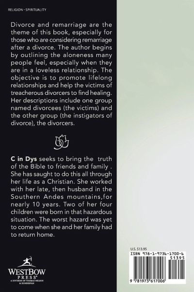 Divorce and remarriage are the theme of this book, especially for those who are considering remarriage after a divorce. The author begins by outlining the aloneness many people feel, especially when they are in a loveless relationship. The objective is to promote lifelong relationships and help the victims of treacherous divorcers to find healing. Her descriptions include one group named divorcees (the victims) and the other group (the instigators of divorce), the divorcers.