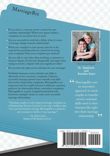 MarriageBiz uses an innovative approach to teach couples to transfer service-oriented skills used in their business life right into their marriage relationship. Profitable businesses teach attitudes and skills to effectively service consumer complaints. Likewise, successful marriage partners have attitudes and skills that resolve relationship complaints. MarriageBiz is an important read for couples because it addresses a primary predictor for relationship failure, unresolved complaints. MarriageBiz is a quick, straightforward book with humorous examples meant to create more successful marriage relationships.