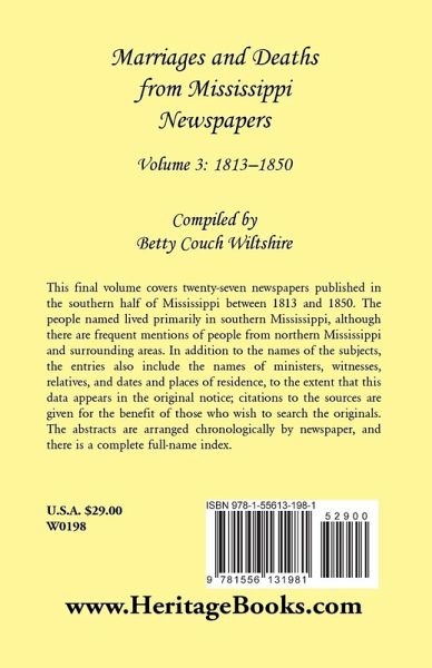 This final volume covers twenty-seven newspapers published in the southern half of Mississippi between 1813 and 1850. The people named lived primarily in southern Mississippi, although there are frequent mentions of people from northern Mississippi and surrounding areas. In addition to the names of the subjects, the entries also include the names of ministers, witnesses, relatives, and dates and places of residence, to the extent that this data appears in the original notice; citations to the sources are given for the benefit of those who wish to search the originals. The abstracts are arranged chronologically by newspaper, and there is a complete full-name index.