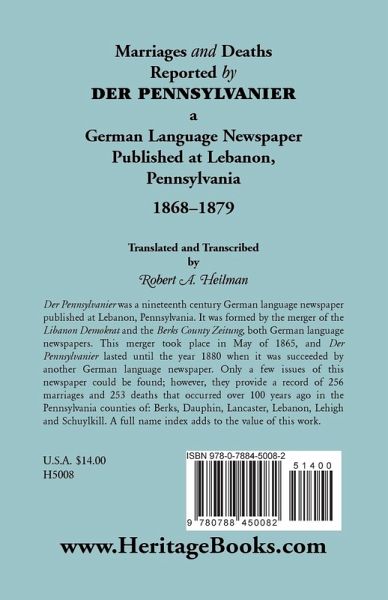 Der Pennsylvanier was a nineteenth century German language newspaper published at Lebanon, Pennsylvania. It was formed by the merger of the Libanon Demokrat and the Berks County Zeitung, both German language newspapers. This merger took place in May of 1865, and Der Pennsylvanier lasted until the year 1880 when it was succeeded by another German language newspaper. Only a few issues of this newspaper could be found; however, they provide a record of 256 marriages and 253 deaths that occurred over 100 years ago in the Pennsylvania counties of: Berks, Dauphin, Lancaster, Lebanon, Lehigh and Schuylkill. A full name index adds to the value of this work.