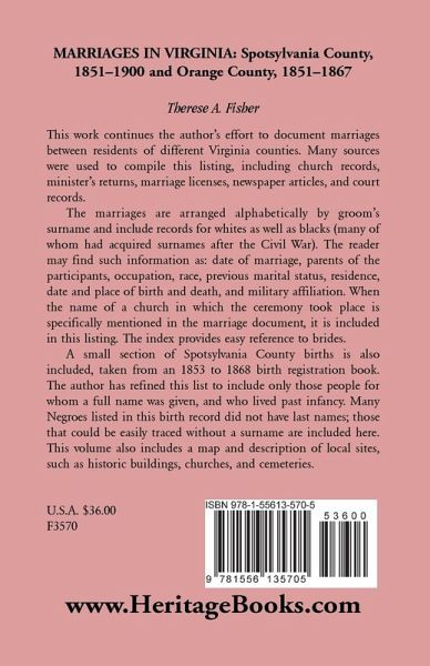 This work continues the author's effort to document marriages between residents of different Virginia counties. Many sources were used to compile this listing, including church records, minister's returns, marriage licenses, newspaper articles, and court records. The marriages are arranged alphabetically by groom's surname and include records for whites as well as blacks (many of whom had acquired surnames after the Civil War). The reader may find such information as: date of marriage, parents of the participants, occupation, race, previous marital status, residence, date and place of birth and death, and military affiliation. When the name of a church in which the ceremony took place is specifically mentioned in the marriage document, it is included in this listing. The index provides easy reference to brides. A small section of Spotsylvania County births is also included, taken from an 1853 to 1868 birth registration book. The author has refined this list to include only those people for whom a full name was given, and who lived past infancy. Many Negroes listed in this birth record did not have last names; those that could be easily traced without a surname are included here. This volume also includes a map and description of local sites, such as historic buildings, churches, and cemeteries.