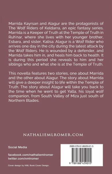 Marrida Kayrsan and Alagur are the protagonists of The Wolf Riders of Keldarra, an epic fantasy series. Marrida is a Keeper of Truth at the Temple of Truth in Ruh'nar, where she lives with her younger brother, Esbara, and sister, Kalisa. Alagur is a Wolf Rider who arrives one day in the city during the latest attack by the Wolf Riders. He is wounded by a defender, and Marrida takes him in, and heals him back to health. It is during this period she reveals to him and her siblings who and what she is at the Temple of Truth. This novella features two stories, one about Marrida and the other about Alagur. The story about Marrida will give a deeper insight to life within the Temple of Truth. The story about Alagur will take you back to the time when he went to get Yalla, his loyal wolf companion, from South Valley of Miza just south of Northern Blades.
