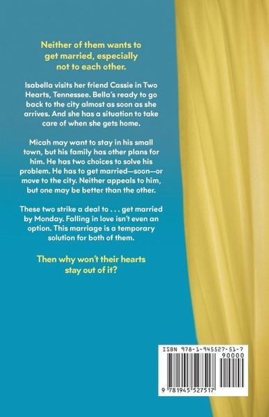 Neither of them wants to get married, especially not to each other. Isabella visits her friend Cassie in Two Hearts, Tennessee. Bella's ready to go back to the city almost as soon as she arrives. And she has a situation to take care of when she gets home. Micah may want to stay in his small town, but his family has other plans for him. He has two choices to solve his problem. He has to get married-soon-or move to the city. Neither appeals to him, but one may be better than the other. These two strike a deal to . . . get married by Monday. Falling in love isn't even an option. This marriage is a temporary solution for both of them. Then why won't their hearts stay out of it? Author's Note: A marriage of convenience. A charming small town. Laughter and fun. A hero who wants to stay. A heroine who longs for city life. Sweet and clean.