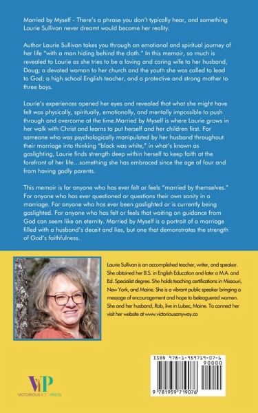 Married by Myself - There's a phrase you don't typically hear, and something Laurie Sullivan never dreamt would become her reality. Author Laurie Sullivan takes you through an emotional and spiritual journey of her life "with a man hiding behind the cloth." In this memoir, so much is revealed to Laurie as she tries to be a loving and caring wife to her husband, Doug; a devoted woman to her church and the youth she was called to lead to God; a high school English teacher, and a protective and strong mother to three boys. Laurie's experiences opened her eyes and revealed that what she might have felt was physically, spiritually, emotionally, and mentally impossible to push through and overcome at the time. Married by Myself is where Laurie grows in her walk with Christ and learns to put herself and her children first. For someone who was psychologically manipulated by her husband throughout their marriage into thinking "black was white," in what's known as gaslighting, Laurie finds strength deep within herself to keep faith at the forefront of her life...something she has embraced since the age of four and from having godly parents. This memoir is for anyone who has ever felt or feels "married by themselves." For anyone who has ever questioned or questions their own sanity in a marriage. For anyone who has ever been gaslighted or is currently being gaslighted. For anyone who has felt or feels that waiting on guidance from God can seem like an eternity. Married by Myself is a portrait of a marriage filled with a husband's deceit and lies, but one that demonstrates the strength of God's faithfulness.