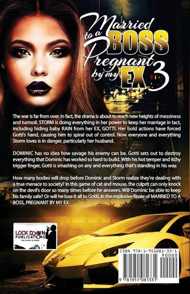 The war is far from over. In fact, the drama is about to reach new heights of messiness and turmoil. STORM is doing everything in her power to keep her marriage in tact, including hiding baby RAIN from her EX, GOTTI. Her bold actions have forced Gotti's hand, causing him to spiral out of control. Now everyone and everything Storm loves is in danger, particularly her husband.DOMINIC has no idea how savage his enemy can be. Gotti sets out to destroy everything that Dominic has worked so hard to build. With his hot temper and itchy trigger finger, Gotti is smashing on any and everything that's standing in his way.How many bodies will drop before Dominic and Storm realize they're dealing with a true menace to society? In this game of cat and mouse, the culprit can only knock on the devil's door so many times before he answers. Will Dominic be able to keep his family safe? Or will he lose it all to Gotti, in the explosive finale of MARRIED TO A BOSS, PREGNANT BY MY EX.