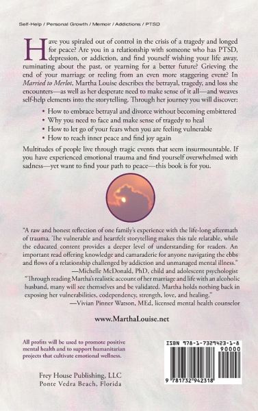 Married to Merlot is an inspirational read for anyone who is facing adversity. Through her unflinching narrative, Martha Louise pens a poignant and candid chronicle of her personal journey impacted by her Vietnam veteran spouse's post-war stress, depression, and alcoholism. When her husband leaves her, Martha finds herself in deep grief with a desperate need for understanding. As she searches for answers, yet another tragic event ambushes her and forces her to a standstill. The author's straightforward account illustrates her heartache as well as her determination to stay the course toward self-discovery and healing. Martha relies on her psychological background and education to weave self-help concepts and messages of hope into her storytelling. The compelling combination of the family's perseverance and the author's fortitude will encourage others in similar circumstances to find the strength to choose their own unique path to recovery and to a happier life.