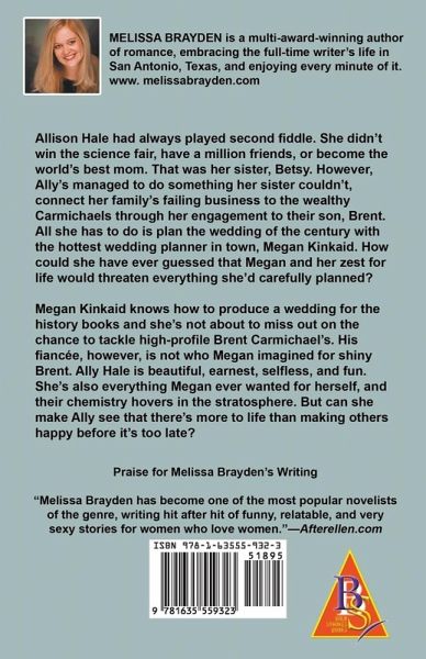 Allison Hale had always played second fiddle. She didn't win the science fair, have a million friends, or become the world's best mom. That was her sister, Betsy. However, Ally's managed to do something her sister couldn't, connect her family's failing business to the wealthy Carmichaels through her engagement to their son, Brent. All she has to do is plan the wedding of the century with the hottest wedding planner in town, Megan Kinkaid. How could she have ever guessed that Megan and her zest for life would threaten everything she'd carefully planned? Megan Kinkaid knows how to produce a wedding for the history books and she's not about to miss out on the chance to tackle high-profile Brent Carmichael's. His fiancée, however, is not who Megan imagined for shiny Brent. Ally Hale is beautiful, earnest, selfless, and fun. She's also everything Megan ever wanted for herself, and their chemistry hovers in the stratosphere. But can she make Ally see that there's more to life than making others happy before it's too late?