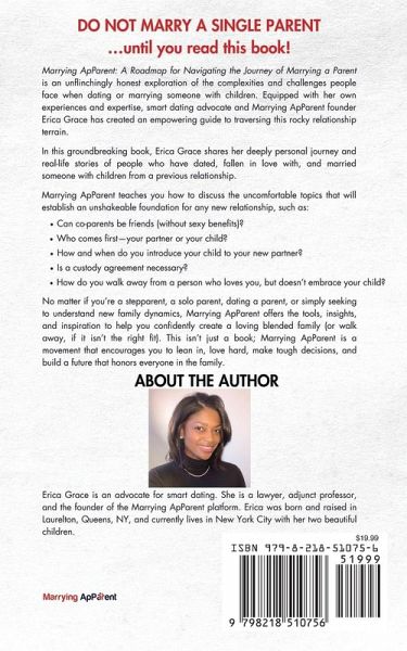 DO NOT MARRY A SINGLE PARENT...until you read this book! Marrying ApParent: A Roadmap for Navigating the Journey of Marrying a Parent is an unflinchingly honest exploration of the complexities and challenges people face when dating or marrying someone with children. Equipped with her own experiences and expertise, smart dating advocate and Marrying ApParent founder Erica Grace has created an empowering guide to traversing this rocky relationship terrain. In this groundbreaking book, Erica Grace shares her deeply personal journey and real-life stories of people who have dated, fallen in love with, and married someone with children from a previous relationship. Marrying ApParent teaches you how to discuss the uncomfortable topics that will establish an unshakeable foundation for any new relationship, such as: Can co-parents be friends (without sexy benefits)? Who comes first-your partner or your child? How and when do you introduce your child to your new partner? Is a custody agreement necessary? How do you walk away from a person who loves you, but doesn't embrace your child? No matter if you're a stepparent, a solo parent, dating a parent, or simply seeking to understand new family dynamics, Marrying ApParent offers the tools, insights, and inspiration to help you confidently create a loving blended family (or walk away, if it isn't the right fit). This isn't just a book-Marrying ApParent is a movement that encourages you to lean in, love hard, make tough decisions, and build a future that honors everyone in the family.