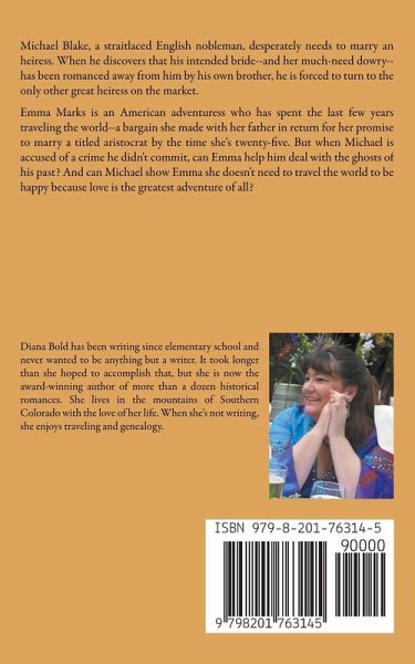 Michael Blake, a straitlaced English nobleman, desperately needs to marry an heiress. When he discovers that his intended bride--and her much-need dowry--has been romanced away from him by his own brother, he is forced to turn to the only other great heiress on the market. Emma Marks is an American adventuress who has spent the last few years traveling the world--a bargain she made with her father in return for her promise to marry a titled aristocrat by the time she's twenty-five. But when Michael is accused of a crime he didn't commit, can Emma help him deal with the ghosts of his past? And can Michael show Emma she doesn't need to travel the world to be happy because love is the greatest adventure of all?