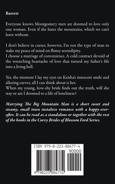 Barrett Everyone knows Montgomery men are doomed to love only one woman. Even if she hates the mountains, which we can't leave without. I don't believe in curses, however, I'm not the type of man to stake my peace of mind on flimsy serendipity. I choose a marriage of convenience. A cold contract devoid of the wrenching heartache of love that turned my father's life into a living hell. Yet, the moment I lay my eyes on Keisha's innocent smile and alluring curves, all I can think about is her. When my young, love-shy bride finds out the truth, will she stay or am I doomed to a life of loneliness? Marrying The Big Mountain Man is a short sweet and steamy, small town instalove romance with a happy-ever-after. It can be read as a standalone or together with the rest of the books in the Curvy Brides of Blossom Ford Series.