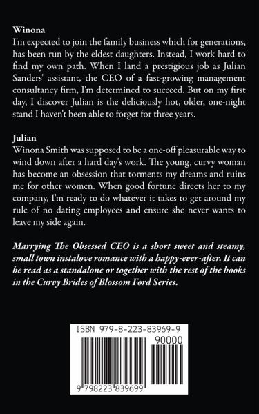 Winona I'm expected to join the family business which for generations, has been run by the eldest daughters. Instead, I work hard to find my own path. When I land a prestigious job as Julian Sanders' assistant, the CEO of a fast-growing management consultancy firm, I'm determined to succeed. But on my first day, I discover Julian is the deliciously hot, older, one-night stand I haven't been able to forget for three years. Julian Winona Smith was supposed to be a one-off pleasurable way to wind down after a hard day's work. The young, curvy woman has become an obsession that torments my dreams and ruins me for other women. When good fortune directs her to my company, I'm ready to do whatever it takes to get around my rule of no dating employees and ensure she never wants to leave my side again. Marrying The Obsessed CEO is a short sweet and steamy, small town instalove romance with a happy-ever-after. It can be read as a standalone or together with the rest of the books in the Curvy Brides of Blossom Ford Series.