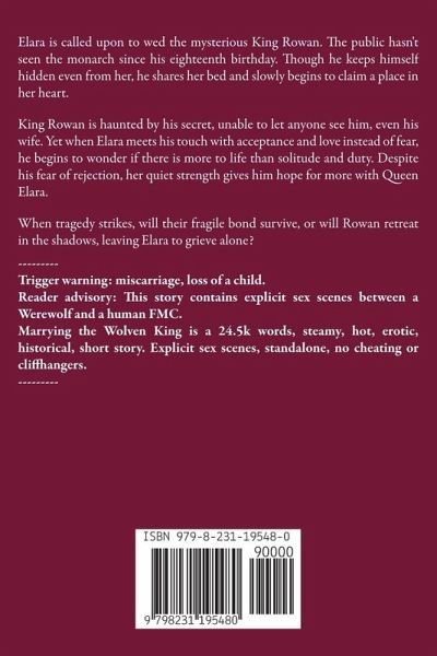 Elara is called upon to wed the mysterious King Rowan. The public hasn't seen the monarch since his eighteenth birthday. Though he keeps himself hidden even from her, he shares her bed and slowly begins to claim a place in her heart. King Rowan is haunted by his secret, unable to let anyone see him, even his wife. Yet when Elara meets his touch with acceptance and love instead of fear, he begins to wonder if there is more to life than solitude and duty. Despite his fear of rejection, her quiet strength gives him hope for more with Queen Elara. When tragedy strikes, will their fragile bond survive, or will Rowan retreat in the shadows, leaving Elara to grieve alone? Excerpt: "Please, Rowan. Let me touch you," I said. "You do not need to touch me." "What if I want to touch you?" I asked. "Do you want my touch?" Rowan growled, tightening his grip on my hand until it ached. "The touch of a Monster that could kill you with one wrong move." I whimpered, causing him to loosen his grip, but before he could pull back, I grabbed him with my free hand. Fur tickled my hand, but I focused on his heavy breathing. "I want the touch of my King, my husband. Please, Rowan. You are just Rowan, right? Be just Rowan with me. If you cannot be free with me, when can you be free?" I asked. He didn't reply, but he moved towards me at astonishing speed. Before I could say another word, I was on my back with his enormous body hovering over me. His unique, musky scent surrounded me. "I am never free of my curse, but when I am with you, I can pretend for a moment," Rowan whispered before his mouth met mine. --------- Trigger warning: miscarriage, loss of a child. Reader advisory: This story contains explicit sex scenes between a Werewolf and a human FMC. Marrying the Wolven King is a 24.5k words, steamy, hot, erotic, historical, short story. Explicit sex scenes, standalone, no cheating or cliffhangers. ---------