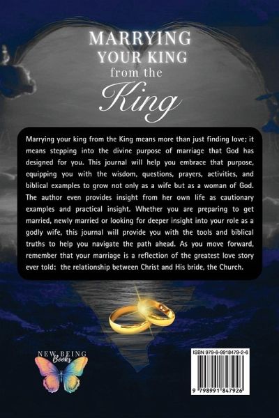 Marrying Your King from the King is more than a guide to finding and maintaining a healthy love. It's an invitation to step into God's divine purpose for marriage. This empowering journal equips women with wisdom, thought-provoking questions, heartfelt prayers, engaging activities, and biblical examples designed to nurture their growth not only as wives but as women of God. Through candid reflections and lessons from her own life, the author provides cautionary tales and practical insights to inspire and guide you. Whether you're preparing for marriage, newly married, or seeking a deeper understanding of your role as a godly wife, this journal offers the tools and biblical truths needed to navigate the journey ahead. Discover how to embrace God's design for marriage and reflect the ultimate love story-the relationship between Christ and His bride, the Church. Marrying Your King from the King will help you build a foundation of faith, love, and purpose in your marriage and beyond.