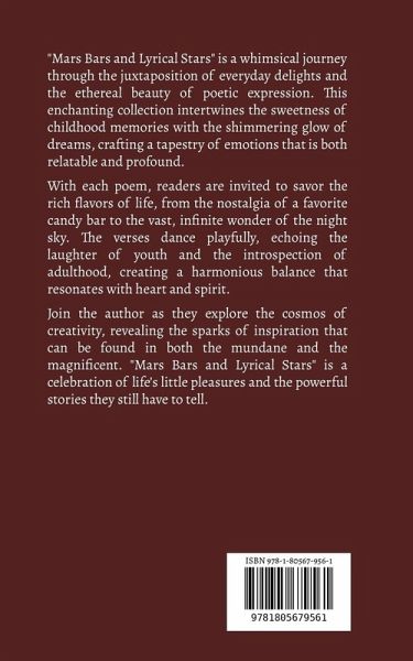 "Mars Bars and Lyrical Stars" is a whimsical journey through the juxtaposition of everyday delights and the ethereal beauty of poetic expression. This enchanting collection intertwines the sweetness of childhood memories with the shimmering glow of dreams, crafting a tapestry of emotions that is both relatable and profound. With each poem, readers are invited to savor the rich flavors of life, from the nostalgia of a favorite candy bar to the vast, infinite wonder of the night sky. The verses dance playfully, echoing the laughter of youth and the introspection of adulthood, creating a harmonious balance that resonates with heart and spirit. Join the author as they explore the cosmos of creativity, revealing the sparks of inspiration that can be found in both the mundane and the magnificent. "Mars Bars and Lyrical Stars" is a celebration of life's little pleasures and the powerful stories they still have to tell.