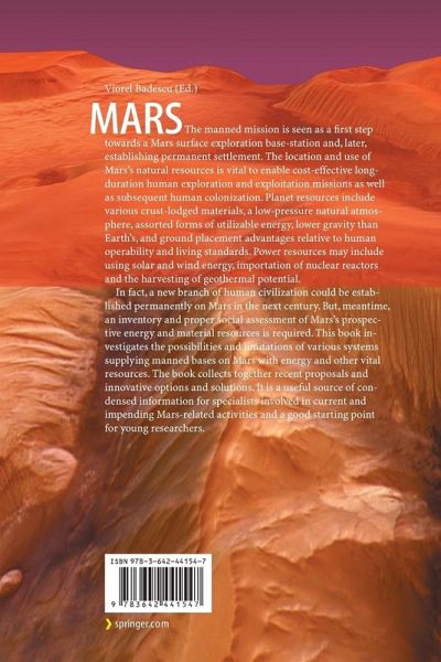 1.- Power System Options for Mars Surface Exploration: Past, Present and Future.- 2.- Available Solar Energy and Weather Forecasting on Mars Surface.- 3.- Weather Influence on PV Solar Cells Operation on Mars.- 4.- Electric Power Generation on Mars Using Photovoltaic Helium Balloons.- 5.- Weather Influence on Solar Thermal Power Plants Operation on Mars.- 6.- Fuel Cell Power System Options for Mars Surface Mission Elements.- 7.- The Evolution of Nuclear Power Generation for Mars.- 8.- Distributed Power Sources for Mars.- 9.- Advanced Nuclear Compact Structures for Power Generation on Mars.- 10.- New Solutions for Nuclear Energy and Flights on Mars.- 11.- Geothermal Energy on Mars.- 12.- Comparative Analysis of Power System Architectures: The Case of Human Mars Surface Missions.- 13.- Economics of Energy on Mars.- 14.- Tumbleweed: A New Paradigm for Surveying the Surface of Mars for In-situ Resources.- 15.- Drilling and Excavation for Construction and In-Situ Resource Utilization.- 16.- In Situ Utilization of Indigenous Resources.- 17.- Available Resources and Energy Sources from Mars Rock and Soil.- 18.- On-Site Resources Availability for Space Agriculture on Mars.- 19.- Utilization of Regolith for Manufacturing Construction Material on Mars.- 20.- Perspectives on the Utilization of Martian Iron and Carbon Dioxide.- 21.- Mars Aqueous Processing System.- 22.- Fundamentals of Human Physical Growth on Mars.- 23.- Artificial Environments on Mars.- 24.- Self-sustaining Martian Colonies Utilizing the North Polar Ice Cap and the Atmosphere.- 25.- Mars Climate Engineering Using Orbiting Solar Reflectors.- 26.- Ecopoiesis and Liquid Water Transportation on Mars.