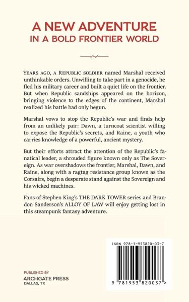 An epic tale of three renegades trapped in a hopeless war, and an ancient secret that will change the world! When an unjust war arrives on his doorstep, a retired gunslinger named Marshal decides it's time to fight again. Marshal vows to stop the Republic's war and joins up with a ragtag resistance group known as the Corsairs, but the rebellion is powerless against the Republic and their unstoppable sandships. Marshal finds help from an unlikely pair: a woman named Dawn, a turncoat scientist willing to expose the Republic's secrets, and boy named Raine, a frontier youth who holds the secret to unlocking a powerful, ancient mystery. But their efforts attract the attention of the Republic's fanatical leader, a shrouded figure known only as The Sovereign. As war looms over the frontier, Marshal, Dawn, and Raine make a desperate stand against the Sovereign and his wicked machines. Fans of Stephen King's THE DARK TOWER series and Brandon Sanderson's ALLOY OF LAW will enjoy getting lost in this steampunk fantasy adventure.
