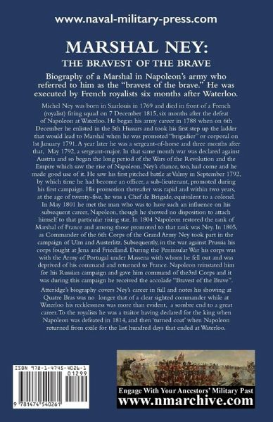 Biography of a Marshal in Napoleon's army who referred to him as the "bravest of the brave." He was executed by French royalists six months after Waterloo. Michel Ney was born in Saarlouis in 1769 and died in front of a French (royalist) firing squad on 7 December 1815, six months after the defeat of Napoleon at Waterloo. He began his army career in 1788 when on 6th December he enlisted in the 5th Hussars and took his first step up the ladder that would lead to Marshal when he was promoted "brigadier" or corporal on 1st January 1791. A year later he was a sergeant-of-horse and three months after that, May 1792, a sergeant-major. In that same month war was declared against Austria and so began the long period of the Wars of the Revolution and the Empire which saw the rise of Napoleon. Ney's chance, too, had come and he made good use of it. He saw his first pitched battle at Valmy in September 1792, by which time he had become an officer, a sub-lieutenant, promoted during his first campaign. His promotion thereafter was rapid and within two years, at the age of twenty-five, he was a Chef de Brigade, equivalent to a colonel.In May 1801 he met the man who was to have such an influence on his subsequent career, Napoleon, though he showed no disposition to attach himself to that particular rising star. In 1804 Napoleon restored the rank of Marshal of France and among those promoted to that rank was Ney. In 1805, as Commander of the 6th Corps of the Grand Army Ney took part in the campaign of Ulm and Austerlitz. Subsequently, in the war against Prussia his corps fought at Jena and Friedland. During the Peninsular War his corps was with the Army of Portugal under Massena with whom he fell out and was deprived of his command and returned to France. Napoleon reinstated him for his Russian campaign and gave him command of the3rd Corps and it was during this campaign he received the accolade "Bravest of the Brave". Atteridge's biography covers Ney's career in full and notes his showing at Quatre Bras was no longer that of a clear sighted commander while at Waterloo his recklessness was more than evident, a sombre end to a great career. To the royalists he was a traitor having declared for the king when Napoleon was defeated in 1814, and then 'turned coat' when Napoleon returned from exile for the last hundred days that ended at Waterloo.