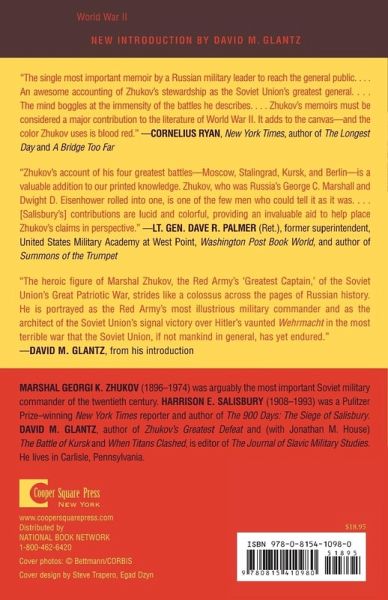 Georgi K. Zhukov (1896-1974) was one of the most important Soviet military commanders of the twentieth century. Harrison E. Salisbury (1908-1993) was the author of Black Night, White Snow and The 900 Days. David M. Glantz, editor of The Journal of Slavic Military Studies, lives in Carlisle, PA, near Harrisburg.