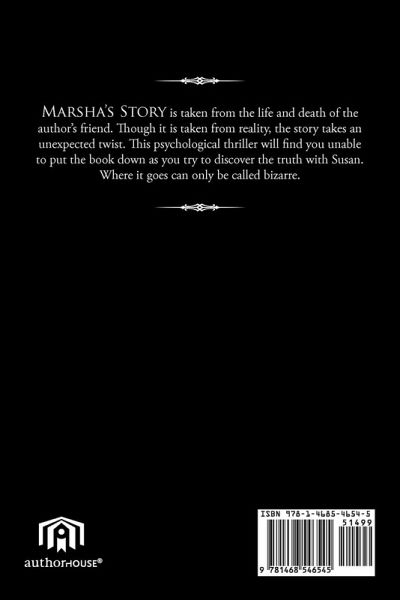 Marsha's Story is taken from the life and death of the author's friend. Though it is taken from reality, the story takes an unexpected twist. This psychological thriller will find you unable to put the book down as you try to discover the truth with Susan. Where it goes can only be called bizarre.