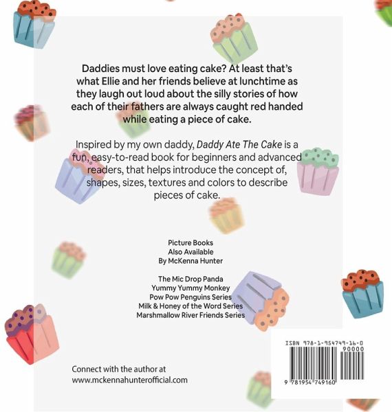 Beginner and early readers will learn how to identify delicious pieces of cake in this introductory Marshmallow River Friends picture book series. Children will learn about the various tasty treats they may have seen their own fathers or family members and friends eat and how to describe them. Don't be surprised if it quickly becomes a favorite they ask to read again and again. Marshmallow River Friends Presents Daddy Ate The Cake! -is part of the Hunter Hemisphere collection of picture books-perfect for: · Beginner and early readers, age 4 through 9. · Reading in any setting, at home or in classrooms, individual or read aloud. · Learning about numbers, tastes, colors, textures and feelings. A perfect gift for special occasions including; Father's Day, birthdays, baby showers, and any special moment that involves cake! This book features a personalization page, leaving room for a sweet gesture and note from the buyer to the recipient. Marshmallow River Friends Presents Daddy Ate The Cake! · Daddies seem to just love eating cake, any time and any place, according to the Marshmallow River Friends. A sweet, tender, and silly exploratory story of the types of cakes children may see their own fathers eat is great for learning, laughing and also bedtime reading. · Get to know the friends and watch their story unfold as they grow from toddlers to preteens. "Daddy Ate The Cake!" is the introduction and prelude picture book in the new and exciting Marshmallow River Friends series! · Features interactive activities that are engaging, and immersive to promote fun passive reading and continual learning. Children will be able to follow along by: naming colors, counting numbers, answering trivia questions about themselves, the author, and so much more!