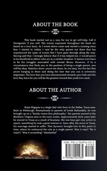This book started out as a way for me to get self-help. Call it therapeutic if you will. The events expressed throughout the book are based on a true story. As I wrote down notes and started a running story line, I started to realize I can't be the only parent out there that has experienced the types of events that I have gone through along the way. Having said that, I strongly believe that if it has helped me, it would prove to be beneficial to others who are in a similar situation. It doesn't even have to be the struggles associated with mental illness. However, if it's a circumstance that finds you in the position of being a single parent, you will be okay. Statistics show, you're not alone. It's not easy, but the fact that you're hanging in there and doing the best that you can is extremely important. The love that you have demonstrated towards your kids and the love they have for you will be the greatest reward that you'll ever need.