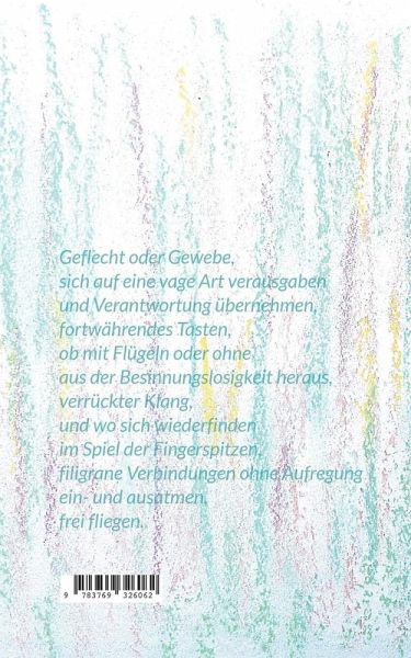 Geflecht oder Gewebe, sich auf eine vage Art verausgaben und Verantwortung übernehmen, fortwährendes Tasten, ob mit Flügeln oder ohne aus der Besinnungslosigkeit heraus, verrückter Klang, und wo sich wiederfinden im Spiel der Fingerspitzen, filigrane Verbindungen ohne Aufregung ein- und ausatmen, frei fliegen.
