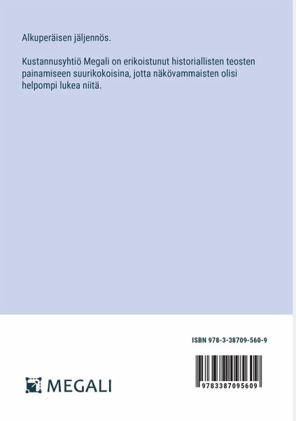 Alkuperäisen jäljennös. Kustannusyhtiö Megali on erikoistunut historiallisten teosten painamiseen suurikokoisina, jotta näkövammaisten olisi helpompi lukea niitä.