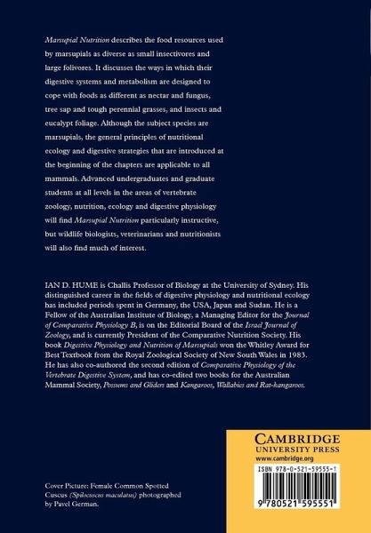 Marsupial Nutrition, first published in 1999, describes the food resources used by marsupials as diverse as small insectivores and large folivores. It discusses the ways in which their digestive systems and metabolism are designed to cope with foods as different as nectar and fungus, tree sap and tough perennial grasses, and insects and eucalypt foliage. Although the subject species are marsupials, the general principles of nutritional ecology and digestive strategies that are introduced at the beginning of the chapters are applicable to all mammals. Advanced undergraduates and graduate students at all levels in the area of vertebrate zoology, nutrition, ecology and digestive physiology will find Marsupial Nutrition particularly instructive, but wildlife biologists, veterinarians and nutritionists will also find much of interest.