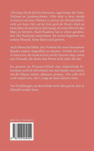 "Der Junge hat die falschen Interessen", sagt Gunter der Vater, Violinist im Landesorchester. "Was nützt es denn, ständig im Internet auf einen Planeten zu starren, der lebensfeindlicher nicht sein kann. Hier auf der Erde spielt die Musik." Karli ist neun Jahre alt und davon überzeugt, als erster Mensch den Mars zu betreten. Nach Pasadena hat er schon geschrieben. Die Nasaleute antworteten. Sie waren begeistert von seinem Wunsch. Seine Eltern sind genervt.Auch Henni hat Mühe, ihre Vorliebe für einen besonderen Kunden anderen begreiflich zu machen. "Verliebe dich nicht in einen Greis, die Freude ist kurz und der Kummer lang", warnt eine Freundin, die denkt, dass Henni nicht mehr alle hat.Isa gewinnt im Provence-Urlaub eine tiefgreifende Erkenntnis, und Lili will einfach nur mal wieder raus, feiern, um die Häuser ziehen, abtanzen, pennen. "Das sollte doch wohl möglich sein, oder?", fragt sie ihren kleinen Sohn. Vier Erzählungen, an deren Ende nicht alles gut ist, aber in Zukunft werden kann.