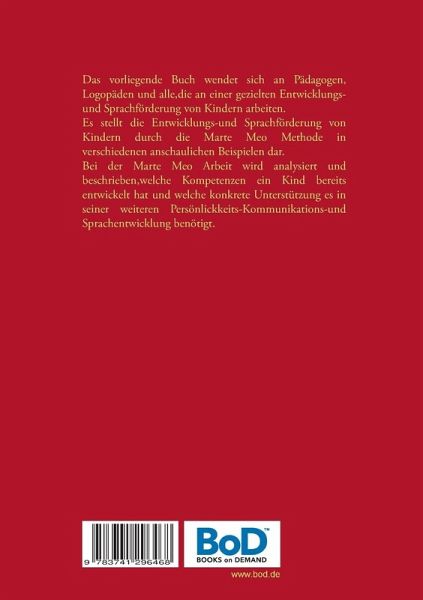 Das vorliegende Buch wendet sich an Pädagogen, Logopäden und alle,die an einer gezielten Entwicklungs-und Sprachförderung von Kindern arbeiten.Es stellt die Entwicklungs-und Sprachförderung von Kindern durch die Marte Meo Methode in verschiedenen anschaulichen Beispielen dar.Bei der Marte Meo Arbeit wird analysiert und beschrieben,welche Kompetenzen ein Kind bereits entwickelt hat und welche konkrete Unterstützung es in seiner weiteren Persönlickkeits-Kommunikations-und Sprachentwicklung benötigt.