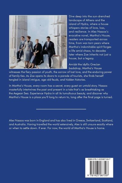 Dive deep into the sun-drenched landscape of Athens and the island of Hydra, where a house whispers stories of love, loss, and resilience. In Alex Nassos's evocative novel, Martha's House, readers are transported across time, from war-torn years where Martha's indomitable spirit forges a life amid chaos, to decades later where Zoe inherits not just a house, but a legacy. Amidst the idyllic Grecian backdrop, Martha's House witnesses the fiery passion of youth, the sorrow of lost love, and the enduring power of family ties. As Zoe opens its doors to a parade of tourists, she finds herself tangled in island intrigue, age-old feuds, and hidden histories. In Martha's House, every room has a secret, every guest an untold story. Nassos masterfully intertwines the past and present in a tale that's as breathtaking as the Aegean Sea. Experience Hydra in all its tumultuous beauty, and discover why Martha's House is a place you'll long to return to, long after the final page is turned. About the Author Alex Nassos was born in England and has also lived in Greece, Scotland, and Australia. Having travelled the world extensively, to more than 70 countries, Alex is still unsure exactly where or when to settle down. If ever. For now, Martha's House is home.