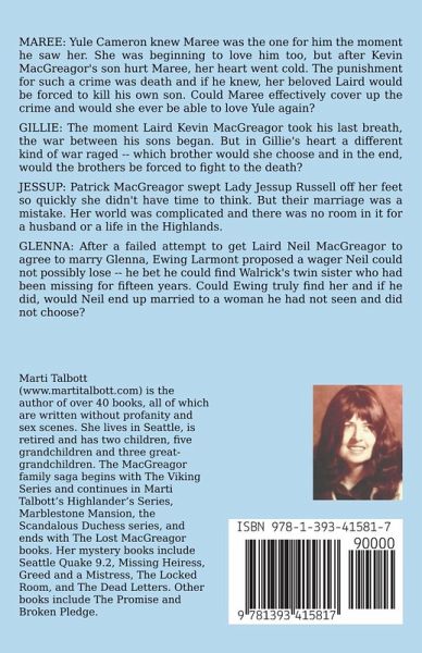 MAREE: Yule Cameron knew Maree was the one for him the moment he saw her. She was beginning to love him too, but after Kevin MacGreagor's son hurt Maree, her heart went cold. The punishment for such a crime was death and if he knew, her beloved Laird would be forced to kill his own son. Could Maree effectively cover up the crime and would she ever be able to love Yule again? GILLIE: The moment Laird Kevin MacGreagor took his last breath, the war between his sons began. But in Gillie's heart a different kind of war raged -- which brother would she choose and in the end, would the brothers be forced to fight to the death? JESSUP: Patrick MacGreagor swept Lady Jessup Russell off her feet so quickly she didn't have time to think. But their marriage was a mistake. Her world was complicated and there was no room in it for a husband or a life in the Highlands. GLENNA: After a failed attempt to get Laird Neil MacGreagor to agree to marry Glenna, Ewing Larmont proposed a wager Neil could not possibly lose -- he bet he could find Walrick's twin sister who had been missing for fifteen years. Could Ewing truly find her and if he did, would Neil end up married to a woman he had not seen and did not choose?