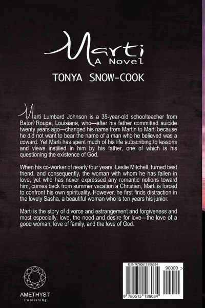 Marti Lumbard Johnson is a 35-year-old schoolteacher from Baton Rouge, Louisiana, who-after his father committed suicide twenty years ago-changed his name from Martin to Marti because he did not want to bear the name of a man who he believed was a coward. Yet Marti has spent much of his life subscribing to lessons and views instilled in him by his father, one of which is his questioning the existence of God. When his co-worker of nearly four years, Leslie Mitchell, turned best friend, and consequently, the woman with whom he has fallen in love, yet who has never expressed any romantic notions toward him, comes back from summer vacation a Christian, Marti is forced to confront his own spirituality. However, he first finds distraction in the lovely Sasha, a beautiful woman who is ten years his junior. Marti is the story of divorce and estrangement and forgiveness and most especially, love, the need and desire for love-the love of a good woman, love of family, and the love of God.