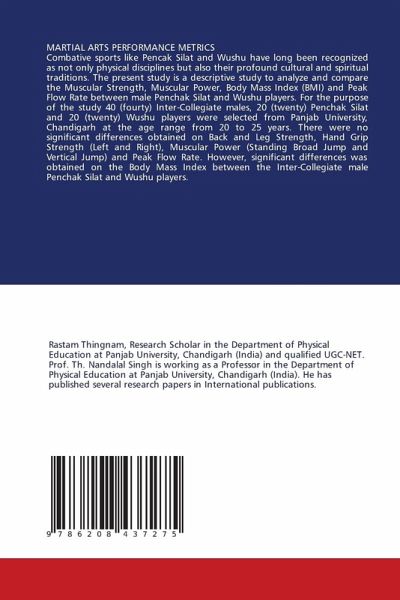 MARTIAL ARTS PERFORMANCE METRICSCombative sports like Pencak Silat and Wushu have long been recognized as not only physical disciplines but also their profound cultural and spiritual traditions. The present study is a descriptive study to analyze and compare the Muscular Strength, Muscular Power, Body Mass Index (BMI) and Peak Flow Rate between male Penchak Silat and Wushu players. For the purpose of the study 40 (fourty) Inter-Collegiate males, 20 (twenty) Penchak Silat and 20 (twenty) Wushu players were selected from Panjab University, Chandigarh at the age range from 20 to 25 years. There were no significant differences obtained on Back and Leg Strength, Hand Grip Strength (Left and Right), Muscular Power (Standing Broad Jump and Vertical Jump) and Peak Flow Rate. However, significant differences was obtained on the Body Mass Index between the Inter-Collegiate male Penchak Silat and Wushu players.