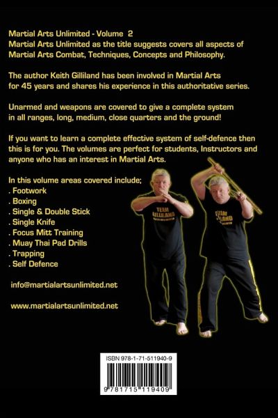 Martial Arts Unlimited as the title suggests covers all aspects of Martial Arts Combat, Techniques, Concepts and Philosophy. The author Keith Gilliland has been involved in Martial Arts for 45 years and shares his experience in this authoritative series. Unarmed and weapons are covered to give a complete system in all ranges, long, medium, close quarters and the ground! If you want to learn a complete effective system of self-defence then this is for you. The volumes are perfect for students, Instructors and anyone who has an interest in Martial Arts. In this volume areas covered include, Footwork . Boxing . Single and Double Stick . Single Knife . Focus Mitt Training . Muay Thai Pad Drills . Trapping . Self Defence