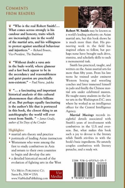 Robert W. Smith may be known as a world's leading authority on Asian martial arts, but this book shows he is much more than that. His pioneering work in the field has inspired others to follow, but perhaps none have brought such drive, stamina, and scholarly skills to such a monumental task. Smith has practiced, taught, and written on the Asian martial arts for more than fifty years. From his late teens he trained under eminent Western boxing and wrestling coaches and later immersed himself in judo and finally the Chinese martial arts under celebrated masters. He taught many students in the latter arts in the Washington D.C. area where he worked as an intelligence officer for the Central Intelligence Agency.Martial Musings records insightful details associated with Smith's years of involvement with combatives in the U.S. and overseas. But, what makes this book such a joy to devour is the literary relish Smith stir-fries in with the book's basic ingredients. He astutely couples combatives with literary panache, and a ready wit.
