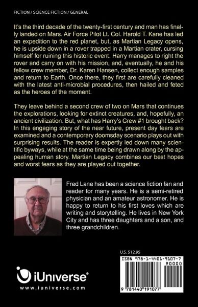 It's the third decade of the twenty-first century and man has finally landed on Mars. Air Force Pilot Lt. Col. Harold T. Kane has led an expedition to the red planet, but, as Martian Legacy opens, he is upside down in a rover trapped in a Martian crater, cursing himself for ruining this historic event. Harry manages to right the rover and carry on with his mission, and, eventually, he and his fellow crew member, Dr. Karen Hansen, collect enough samples and return to Earth. Once there, they first are carefully cleaned with the latest anti-microbial procedures, then hailed and feted as the heroes of the moment. They leave behind a second crew of two on Mars that continues the explorations, looking for extinct creatures, and, hopefully, an ancient civilization. But, what has Harry's Crew #1 brought back? In this engaging story of the near future, present day fears are examined and a contemporary doomsday scenario plays out with surprising results. The reader is expertly led down many scientific byways, while at the same time being drawn along by the appealing human story. Martian Legacy combines our best hopes and worst fears as they are played out together.
