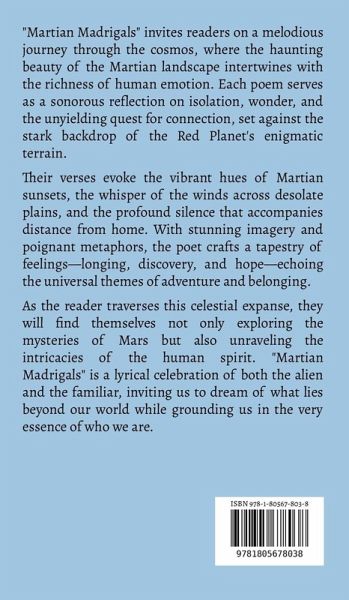 "Martian Madrigals" invites readers on a melodious journey through the cosmos, where the haunting beauty of the Martian landscape intertwines with the richness of human emotion. Each poem serves as a sonorous reflection on isolation, wonder, and the unyielding quest for connection, set against the stark backdrop of the Red Planet's enigmatic terrain. Their verses evoke the vibrant hues of Martian sunsets, the whisper of the winds across desolate plains, and the profound silence that accompanies distance from home. With stunning imagery and poignant metaphors, the poet crafts a tapestry of feelings-longing, discovery, and hope-echoing the universal themes of adventure and belonging. As the reader traverses this celestial expanse, they will find themselves not only exploring the mysteries of Mars but also unraveling the intricacies of the human spirit. "Martian Madrigals" is a lyrical celebration of both the alien and the familiar, inviting us to dream of what lies beyond our world while grounding us in the very essence of who we are.