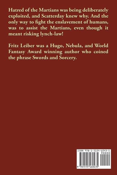 Hatred of the Martians was being deliberately exploited, and Scatterday knew why. And the only way to fight the enslavement of humans, was to assist the Martians, even though it meant risking lynch-law! Fritz Leiber was a Hugo, Nebula, and World Fantasy Award winning author who coined the phrase Swords and Sorcery.