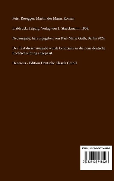 Peter Rosegger: Martin der Mann. Roman Erstdruck: Leipzig, Verlag von L. Staackmann, 1908. Neuausgabe, herausgegeben von Karl-Maria Guth, Berlin 2024. Der Text dieser Ausgabe wurde behutsam an die neue deutsche Rechtschreibung angepasst. Gesetzt aus der Minion Pro, 11 pt. Henricus - Edition Deutsche Klassik GmbH