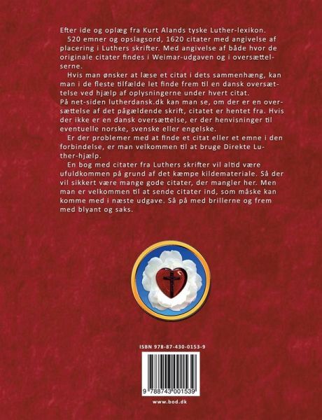 Efter idé og oplæg fra Kurt Alands tyske Luther-lexikon. 620 emner og opslagsord, 1620 citater med angivelse af placering i Luthers skrifter. Med angivelse af både hvor de originale citater findes i Weimar-udgaven og i oversættelserne. Hvis man ønsker at læse et citat i dets sammenhæng, kan man i de fleste tilfælde let finde frem til en dansk oversættelse ved hjælp af oplysningerne under hvert citat. På net-siden lutherdansk.dk kan man se, om der er en oversættelse af det pågældende skrift, citatet er hentet fra. Hvis der ikke er en dansk oversættelse, er der henvisninger til eventuelle norske, svenske eller engelske. Er der problemer med at finde et citat eller et emne i den forbindelse, er man velkommen til at bruge Direkte Luther-hjælp. En bog med citater fra Luthers skrifter vil altid være ufuldkommen på grund af det kæmpe kildemateriale. Så der vil sikkert være mange gode citater, der mangler her. Men man er velkommen til at sende citater ind, som måske kan komme med i næste udgave. Så på med brillerne og frem med blyant og saks.