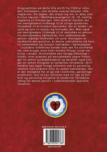 Originaltitlen på dette lille skrift fra 1530 er »Von den Schlüsseln«, som direkte oversat betyder »Om nøglerne«. De nøgler, det drejer sig om, er dem, som Kristus nævner i Matthæusevangeliet 16, 19, nemlig nøglerne til Himmeriget. Helt konkret handler det om menighedens fuldmagt til at tilsige syndernes forladelse til et kristent menneske, der er faldet i en synd og som nu angrer og fortryder det. Men også om menighedens fuldmagt til at udelukke en person fra menighedens fællesskab, hvis vedkommende person stædigt fastholder sin synd. Hensigten er imidlertid den positive, at denne udelukkelse må føre til omvendelse og fornyet indtræden i fællesskabet. I nutidens folkekirke kender man det fra skriftemålet, som bruges mere eller mindre flittigt rundt omkring i landet. Skriftemålet kan foregå offentligt i kirken, hvor præsten på menighedens vegne fremsiger en almen syndsbekendelse og derefter også tilsiger en almen tilsigelse af syndernes forladelse. Skriftemålet kan også foregå enkeltvis ved en personlig samtale med præsten eller en anden sjælesørger. Her er der mulighed for at gå ind i konkrete, personlige problemer, som så kan afsluttes med en lige så konkret og personlig tilsigelse af syndernes forladelse netop for denne person i vedkommendes specielle situation. Hovedvægten ligger altså ikke på en opremsning af en række synder, men i den hjælp, man kan hente i de ting, man kæmper med og lider under, og i den helt personlige tilsigelse af syndernes forladelse. Det sidste er det, man kalder absolution, som betyder »at løse«, underforstået, at løse fra synden. Det er her nøglerne kommer ind, som det middel, der løser fra synden. Nøglerne løser eller låser op. De løser fra synden og låser op til Himmerige. Det er derfor Kristus kalder dem Himmeriges nøgler. I titlen har jeg valgt at oversætte og kalde disse nøgler for »Nådens nøgler«, fordi de helt bogstaveligt formidler Guds nåde til den enkelte. De er nådemidler på linje med prædikenen, dåben og nadveren. Om man så også direkte vil kalde dem sakramenter er for Luther udelukkende et definitionsspørgsmål. Men at nøglerne og absolutionen er et nådemiddel, hersker de på intet tidspunkt tvivl om hos Luther. Teksten er oversat fra Weimar-udgaven 30 II, 465-507. Overskrifterne er ikke oprindelige.