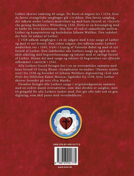 Luther skrevet omkring 40 sange. De fleste så dagens lys i 1524, hvor de første evangeliske sangbøger gik i trykken. Den første sangbog, der udkom under Luthers medvirken og med hans forord, er »Geystliche gesang Buchleyn«, Wittenberg 1524. Dette er en korsangbog med et hæfte for hver korstemme. Den blev til ved et samarbejde mellem Luther og komponisten og korlederen Johann Walther. Den indeholder hele 24 salmer af Luther. I 1528 udkom sangbogen i en ny udgave med 4 nye sange af Luther og med et nyt forord. Den sidste udgave, der udkom under Luthers medvirken var i 1545, trykt i Lepzig af Valentin Babst og med et nyt forord af Luther. Den indeholder alle Luthers sange og også en særskilt afdeling med begravelsessange og tekster med et særligt forord af Luther. Denne del med sange og tekster til begravelser var allerede udkommet i særtryk i 1542. Alle Luthers forord bringes her i en ny oversættelse sammen med hans forord til Georg Rhaus »Symphoniae iucundae« (Skønne symfonier) fra 1538 og forordet til Johann Walthers digtsamling »Lob und Preis der löblichen Kunst Musica« ligeledes fra 1538, hvor Luther skriver forordet på vers »Fru Musik«. Desuden bringes alle Luthers sange i originaludgaverne sammen med en ordret dansk oversættelse, som ikke direkte er sangbar, men til gengæld får alle Luthers tanker med. Det går ofte tabt ved en gendigtning, som skal passe med versefødderne. I øvrigt findes 21 af Luthers sange gendigtet i Den Danske Salmebog med større eller mindre held.