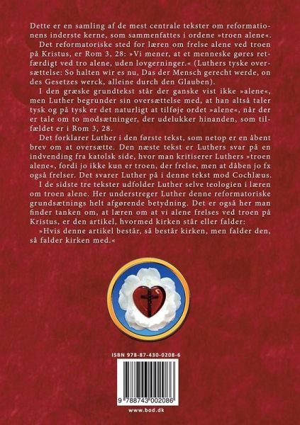Dette er en samling af de mest centrale tekster om reformationens inderste kerne, som sammenfattes i ordene »troen alene«. Det reformatoriske sted for læren om frelse alene ved troen på Kristus, er Rom 3, 28: »Vi mener, at et menneske gøres retfærdigt ved tro alene, uden lovgerninger.« (Luthers tyske oversættelse: "So halten wir es nu, Das der Mensch gerecht werde, on des Gesetzes werck, alleine durch den Glauben"). I den græske grundtekst står der ganske vist ikke »alene«, men Luther begrunder sin oversættelse med, at han altså taler tysk og på tysk er det naturligt at tilføje ordet »alene«, når der er tale om to modsætninger, der udelukker hinanden, som tilfældet er i Rom 3, 28. Det forklarer Luther i den første tekst, som netop er en åbent brev om at oversætte. Den næste tekst er Luthers svar på en indvending fra katolsk side, hvor man kritiserer Luthers »troen alene«, fordi jo ikke kun er troen, der frelse, men at dåben jo fx også frelser. Det svarer Luther på i denne tekst mod Cochlæus. I de sidste tre tekster udfolder Luther selve teologien i læren om troen alene. Her understreger Luther denne reformatoriske grundsætnings helt afgørende betydning. Det er også her man finder tanken om, at læren om at vi alene frelses ved troen på Kristus, er den artikel, hvormed kirken står eller falder: »Hvis denne artikel består, så består kirken, men falder den, så falder kirken med.«
