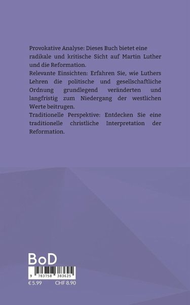 Dieser provokative Text wirft einen ungewöhnlichen und kritischen Blick auf Martin Luther und die Reformation. Lothar-Rüdiger Lütge untersucht die tiefgreifenden und oft destruktiven Folgen von Luthers Thesen und Lehren. Beginnend mit einem historischen Rückblick auf das Christentum zeigt der Autor, wie Luthers revolutionäre Ideen zur Trennung von Kirche und Staat führten und damit die Fundamente der westlichen Kultur erschütterten.Lütge beschreibt anschaulich, wie die Betonung individueller Glaubensakte und göttlicher Gnade die Autorität der Kirche schwächte und letztlich den Aufstieg säkularer Staatsformen und liberaler Ideologien begünstigte. Diese Entwicklung wird als ein zentraler Faktor für den heutigen Werteverfall und den Niedergang der abendländischen Zivilisation dargestellt.Der Text bietet eine tiefgehende Analyse und fordert etablierte Sichtweisen heraus, indem er alternative Perspektiven aufzeigt. Ziel ist es, den Leser zum Nachdenken anzuregen und eine differenzierte Diskussion über die weitreichenden Folgen der Reformation zu fördern. Eine faszinierende und herausfordernde Lektüre für alle, die sich mit den historischen und kulturellen Umbrüchen des Abendlandes auseinandersetzen möchten.