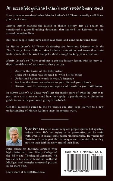 Have you ever wondered what Martin Luther's 95 Theses actually said? If so, you're not alone. Finally, there's an accessible guide to Luther's most revolutionary words. Martin Luther changed the course of church history. His 95 Theses are considered a groundbreaking document that sparked the Reformation and altered countless lives. But most people today have never read them and don't understand them. In Martin Luther's 95 Theses: Celebrating the Protestant Reformation in the 21st Century, Peter DeHaan takes Luther's contentions and turns them into understandable, bite-sized snippets, short enough to keep your attention. He explains their meaning and makes them accessible for today's reader. With a helpful snapshot of Martin Luther's life, you'll get an easy-to-understand overview of the historical and religious context of his day, as well as the impact of his history-making document. Martin Luther's 95 Theses combines a concise history lesson with an easy-to-digest breakdown of each one so that you can: ¿ Uncover the basics of the Reformation ¿ Learn why Luther was inspired to write his 95 theses ¿ Understand Luther's words in today's language ¿ See how the theses are relevant to your life and your church ¿ Discover how his message can inspire and transform your faith today In Martin Luther's 95 Theses you'll get the inside story of what led Luther to post these vital statements and how they apply to people today. A discussion guide to use with your small group is included. An advocate for authentic church practices, Peter DeHaan, PhD sees reform as an ongoing process in order to advance the kingdom of God. His desire is to encourage Christians to better align their lives with their faith. Let Martin Luther's 95 Theses inspire you to learn more about the radical document that changed the course of church history and still impacts people today. You'll finally understand what Luther's words mean and how you can apply them to your life. Get this accessible guide to the 95 Theses and start your journey to a new understanding of Martin Luther's most important work. ¿[This book was first published as 95 Tweets.]