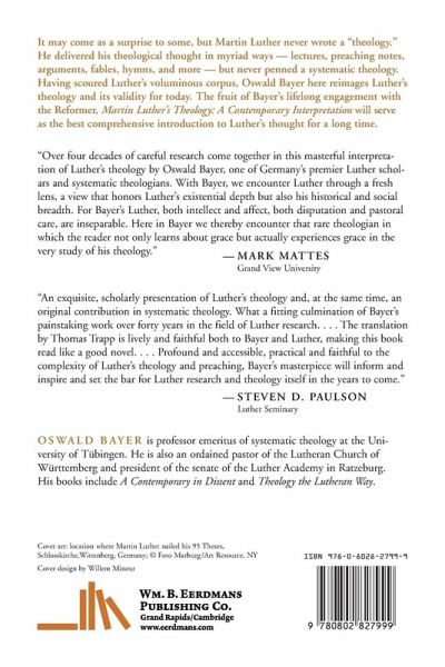 Forty years of in-depth research on Martin Luther's theology uniquely qualifies Oswald Bayer to present this comprehensive introduction to Luther's thought, written for those lacking an academic background in theology. Bayer's noteworthy study explores the basics of Luther's understanding of theology, discussing his response to the "philosophy of science" tradition, the formula by which he studied theology, and the basic philosophy that informed him. Bayer then takes Luther's stance on Christian dogmatics and ethics and applies it to our own theological understanding in the modern age. With such a complete Lutheran dogmatic concept -- the first of its kind offered -- the stunning inner consistency of Luther's theology and its ease of application to contemporary studies become unmistakably clear.